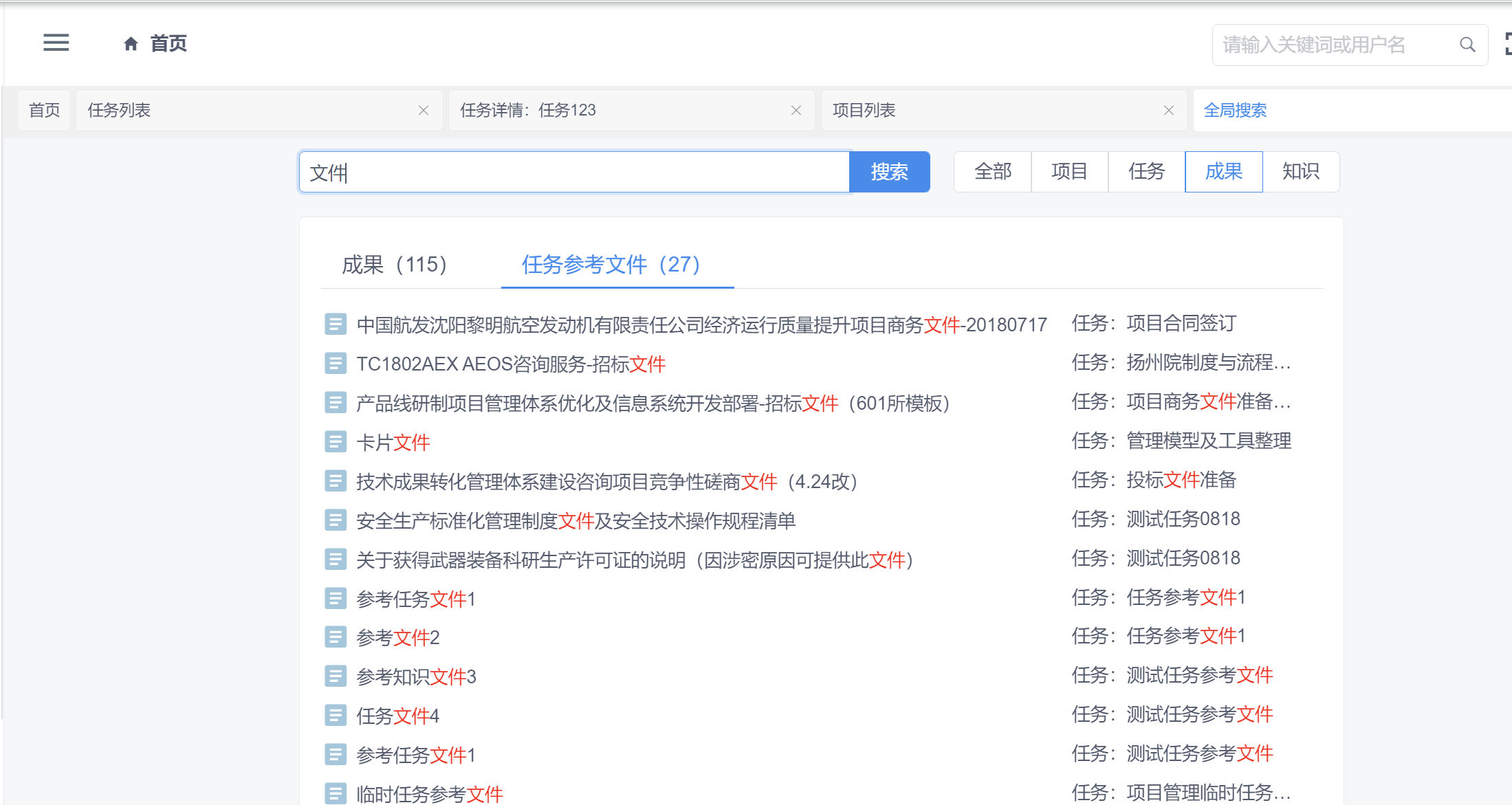 全局搜索增加知识附件、及任务模板参考文件检索功能;