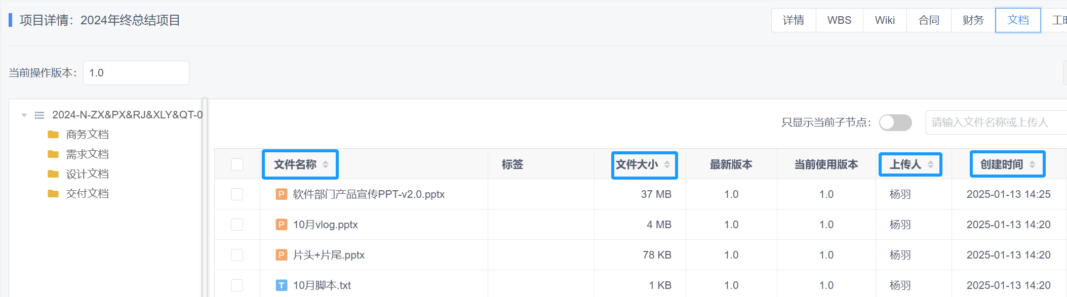 4.项目文档(PBS)列表新增字段排序及列宽调整功能,支持文件移动