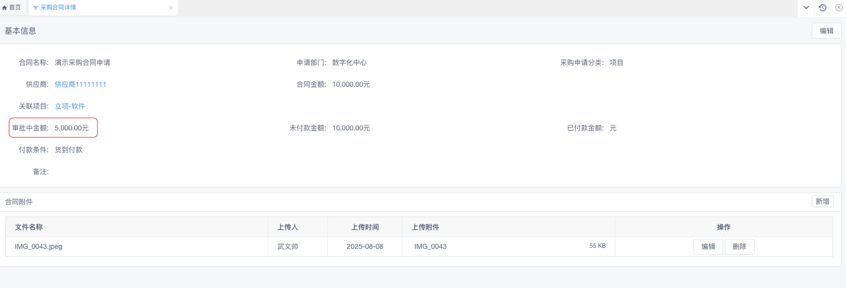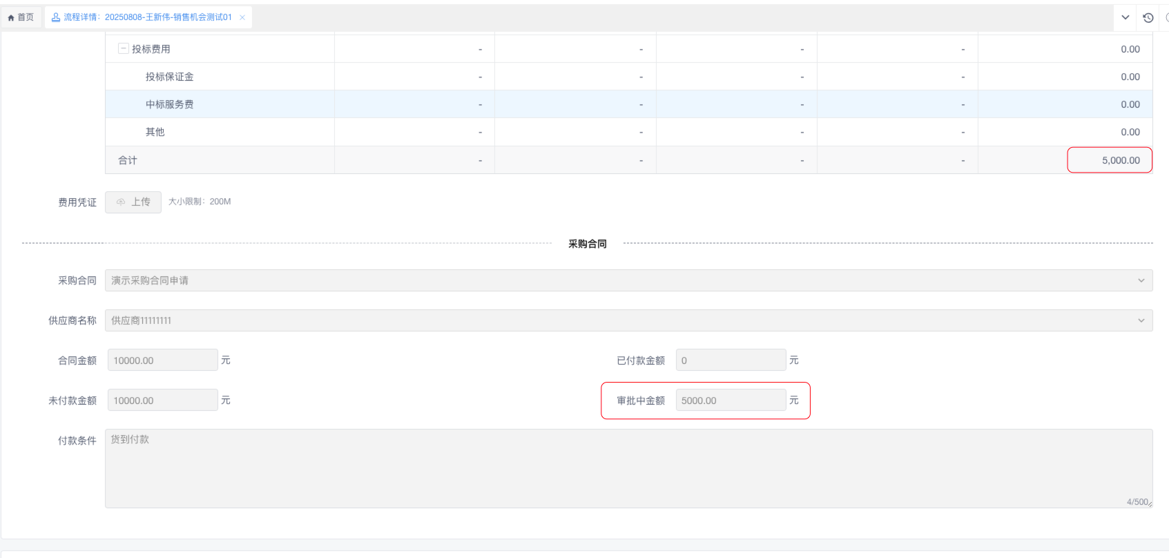 发布流程后,自动将流程的申请金额带入到审批中金额,并在合同中显示此合同相关的流程的审批中金额