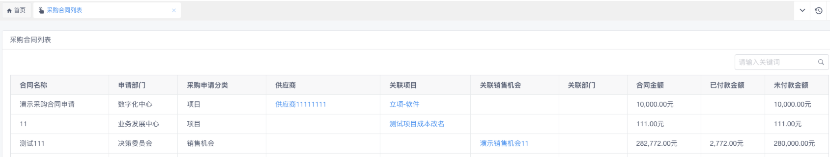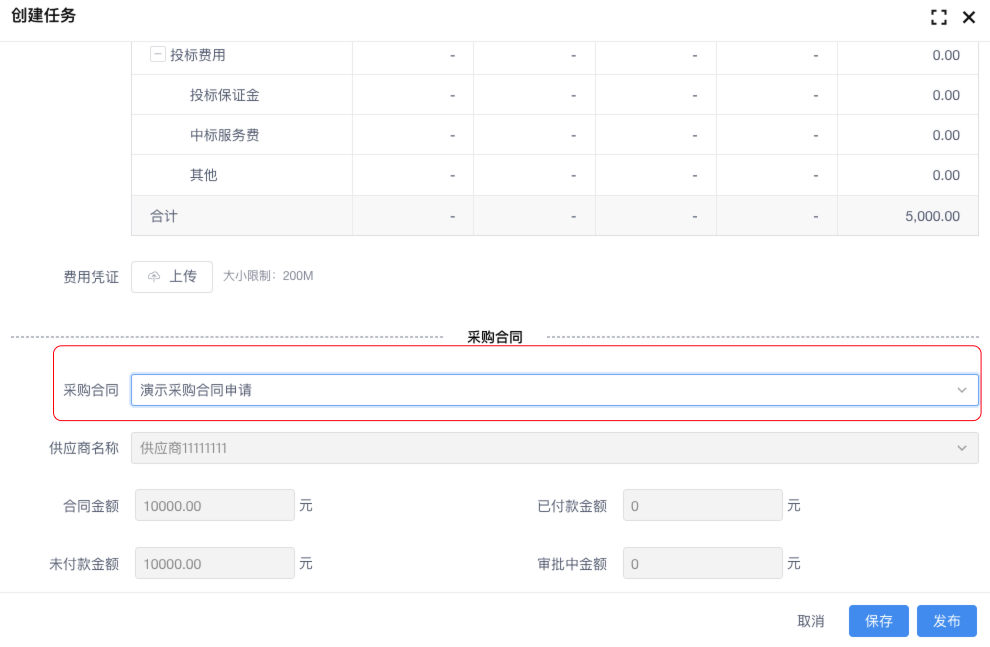 发起费用申请流程时,增加关联采购合同功能,选择合同后,自动带入相关信息