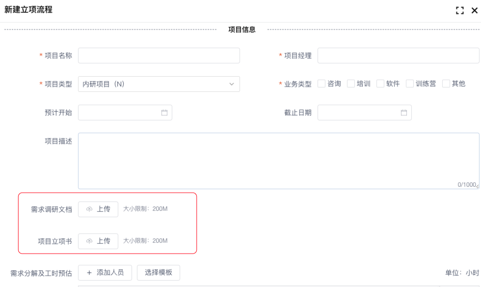 1.当项目类型为“内研项目”时,增加需求调研文档、项目立项书上传按钮