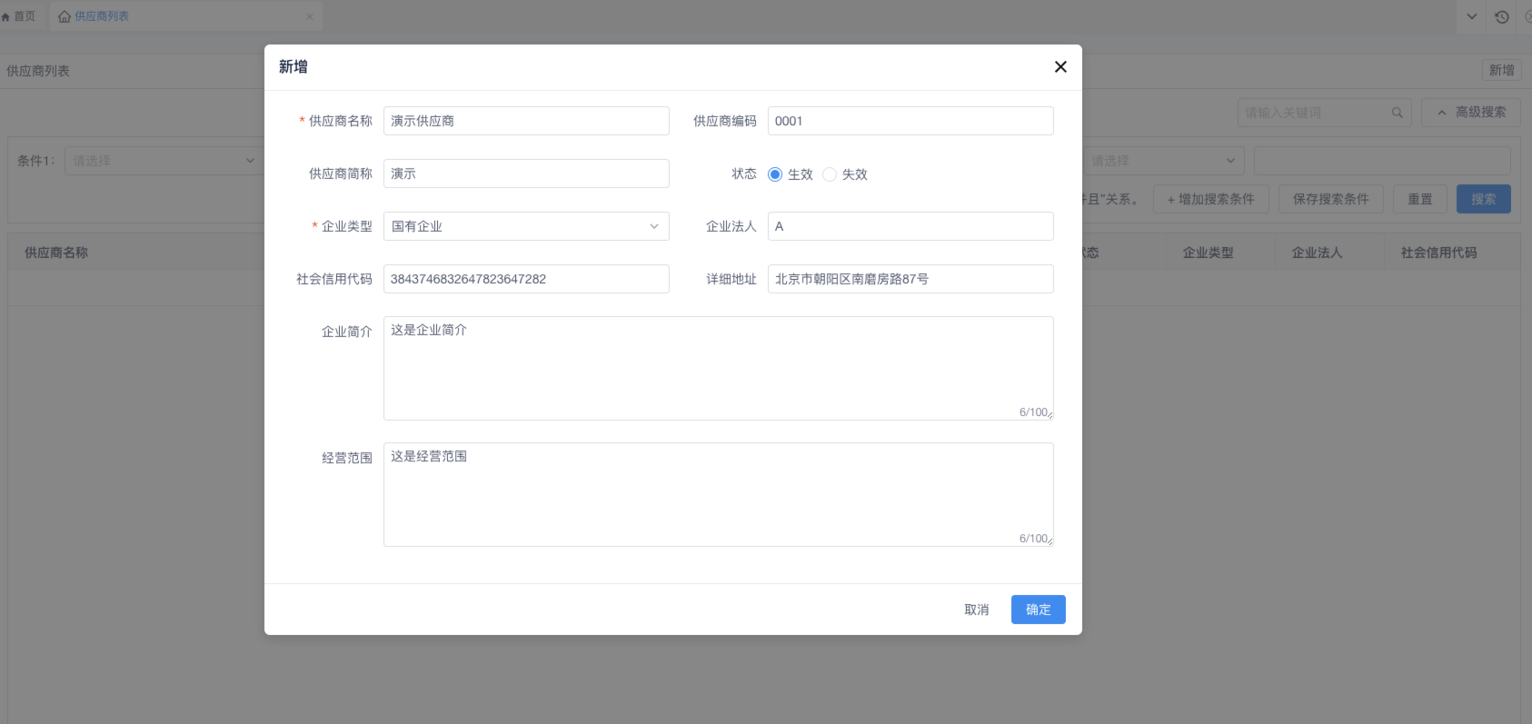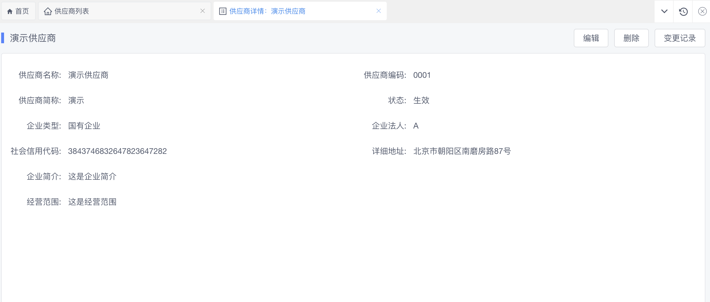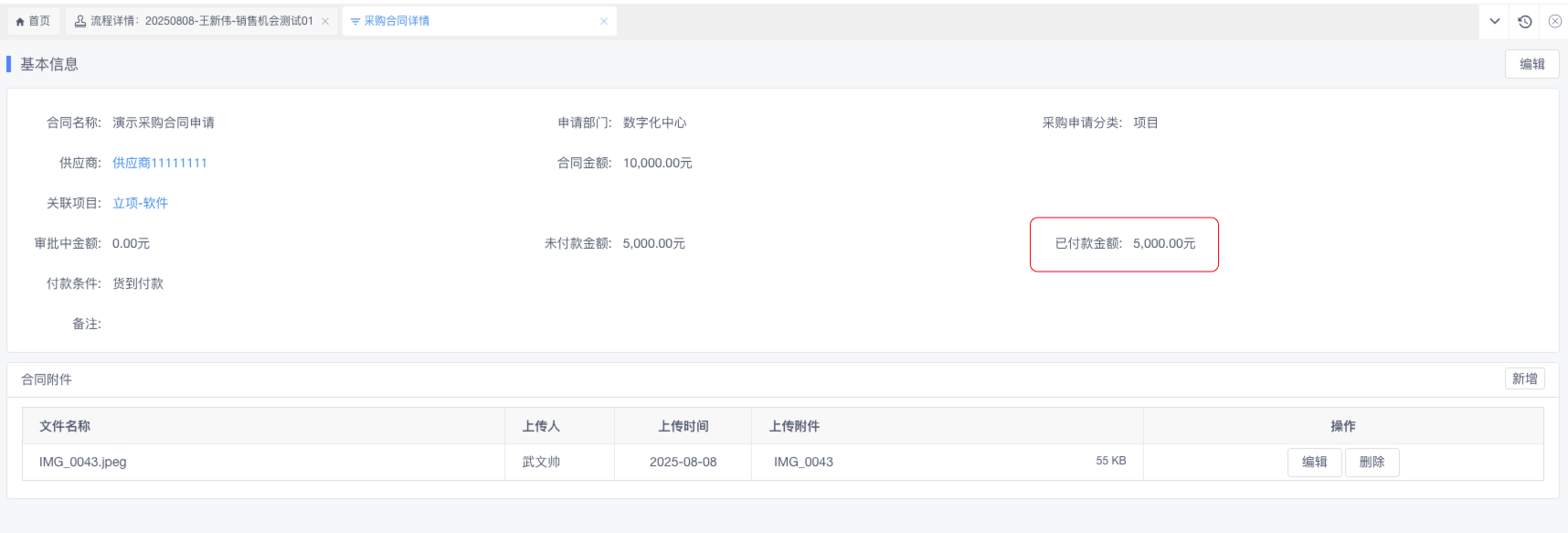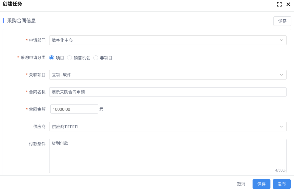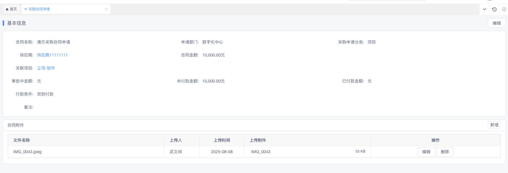 流程发起申请时可选择系统中供应商,填写合同相关信息及附件,流程结束后,生成采购合同