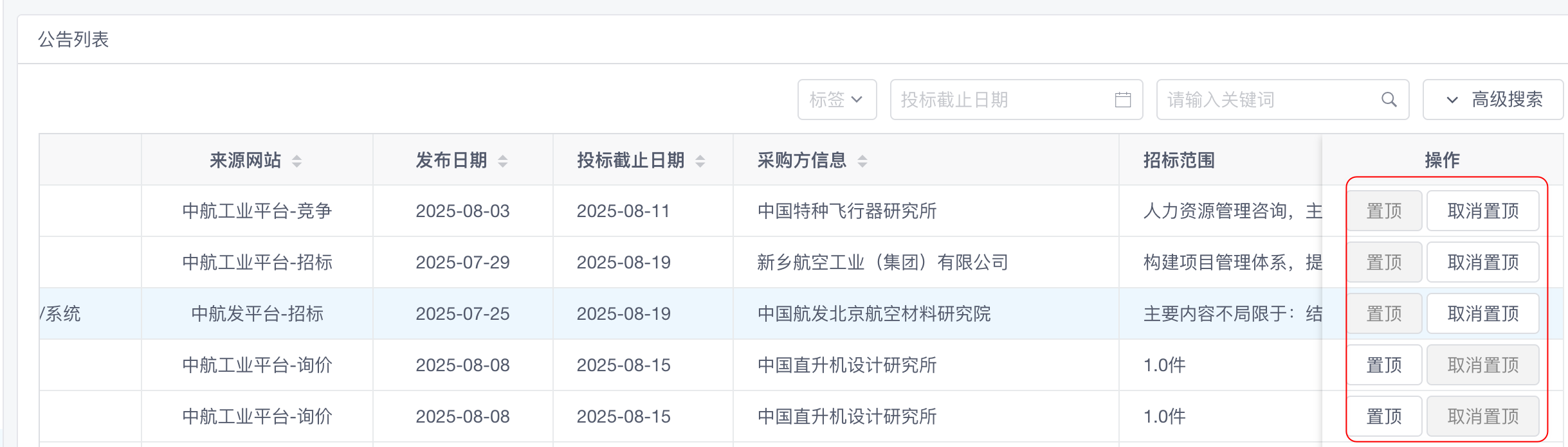 1.招标公告增加“置顶”按钮,点击可进行置顶及取消置顶