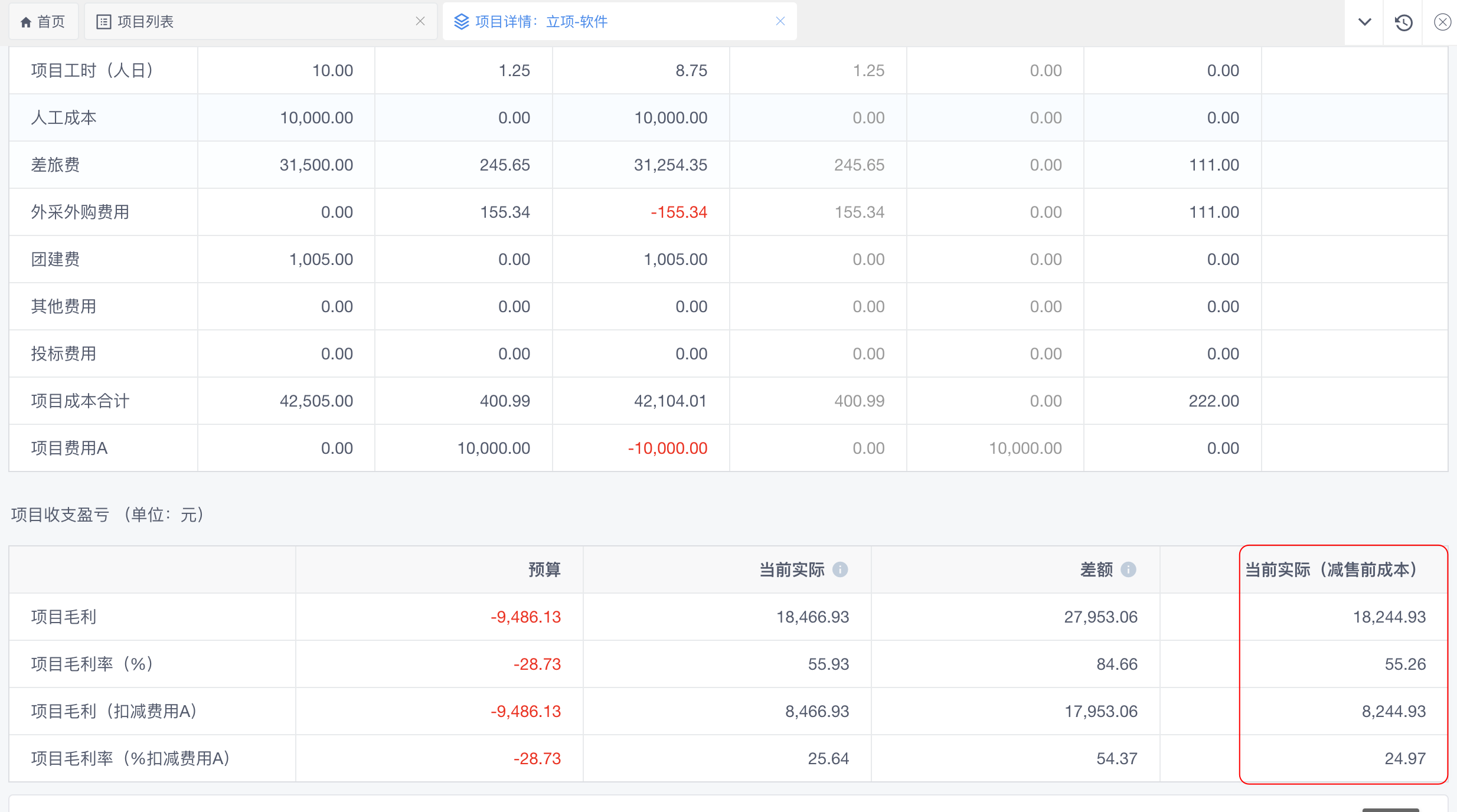 3.项目详情-项目毛利计算增加 当前实际(减售前成本) 列