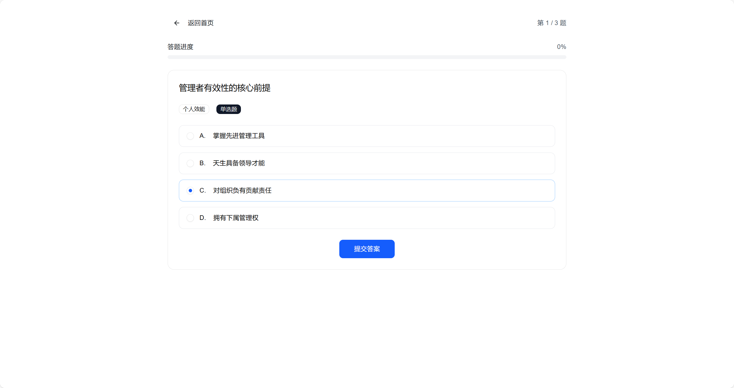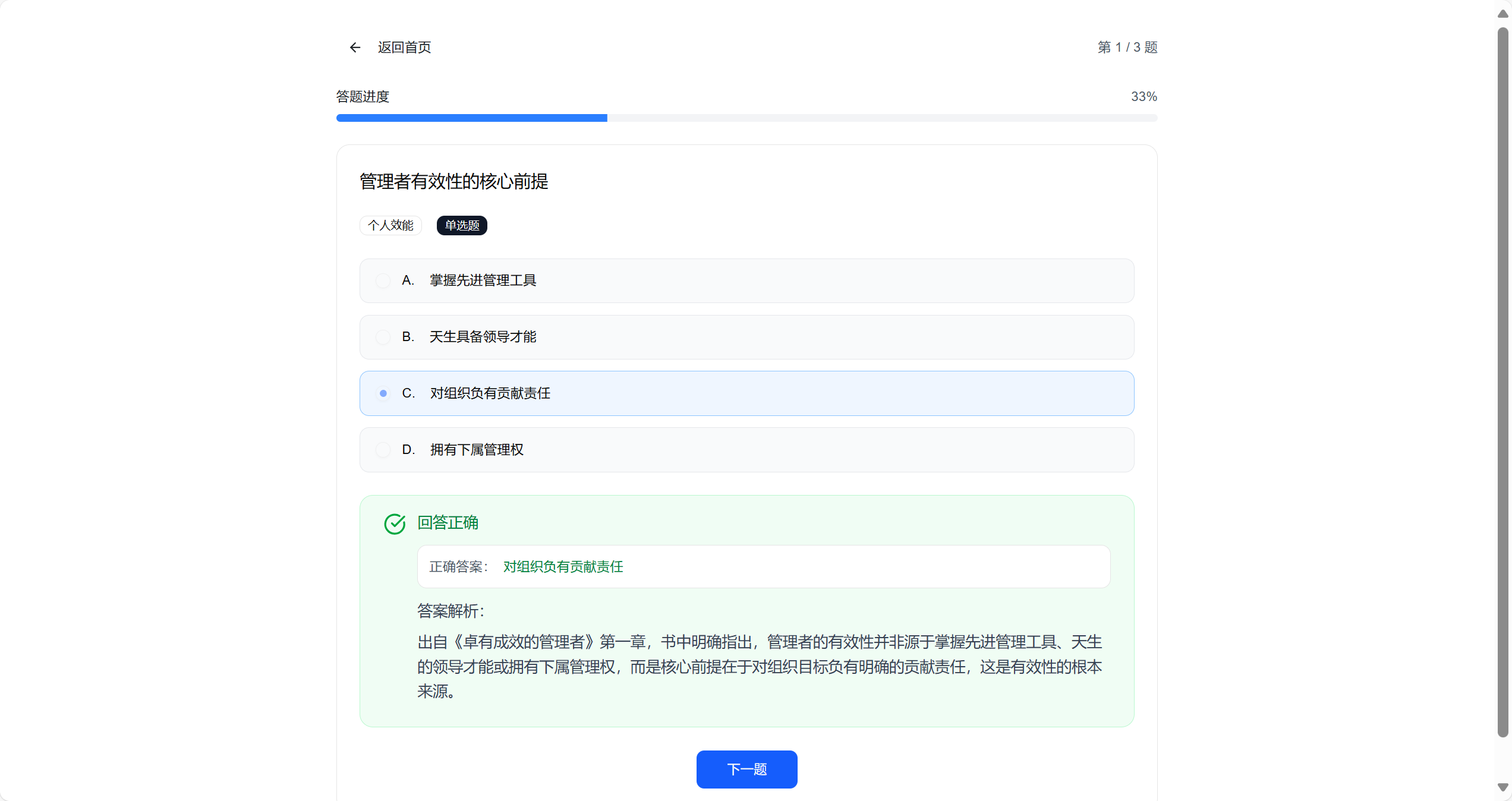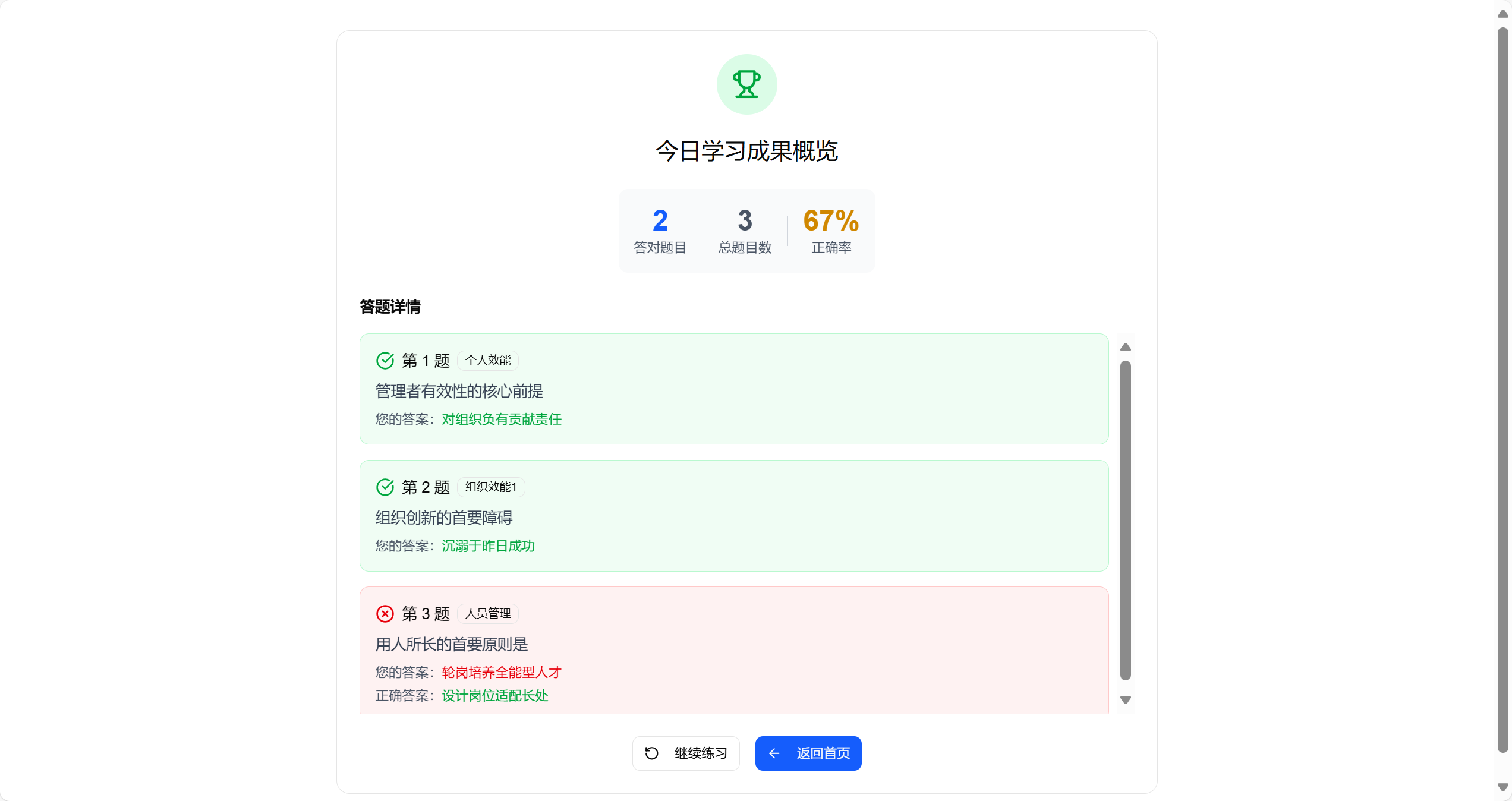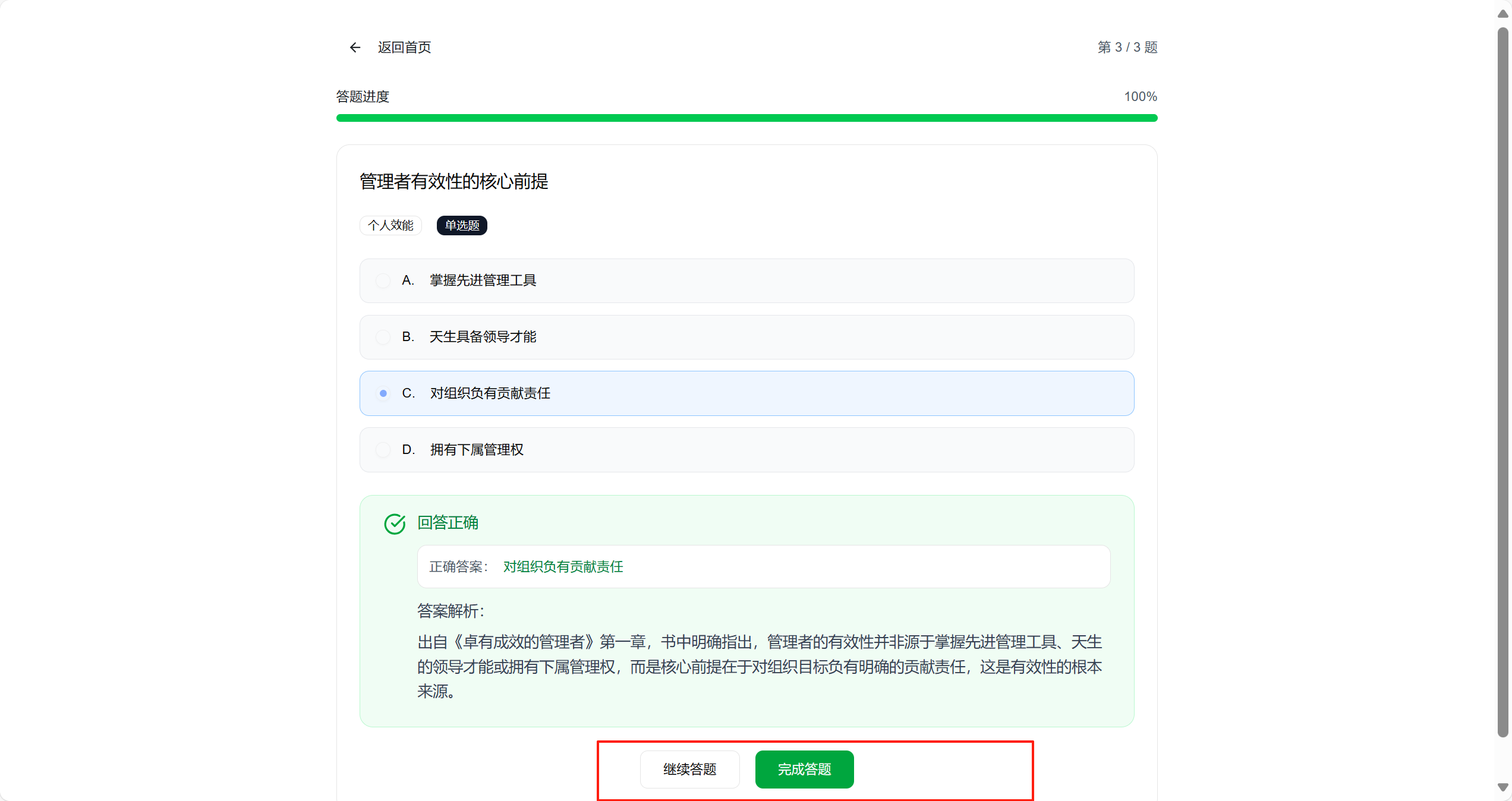点击 完成答题:查看本次答题的“学习成果概览”。 点击 继续答题:继续作答更多题目。