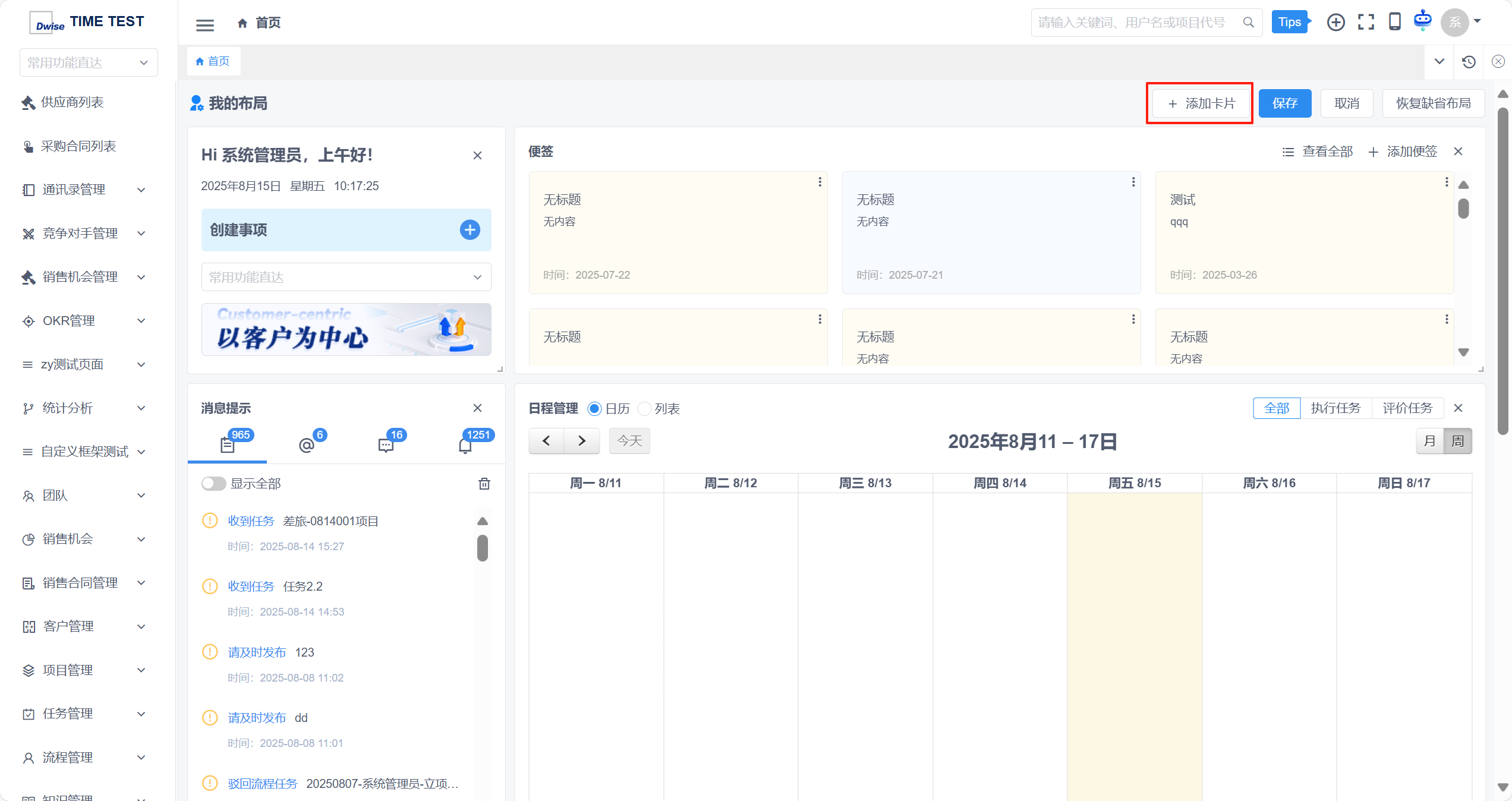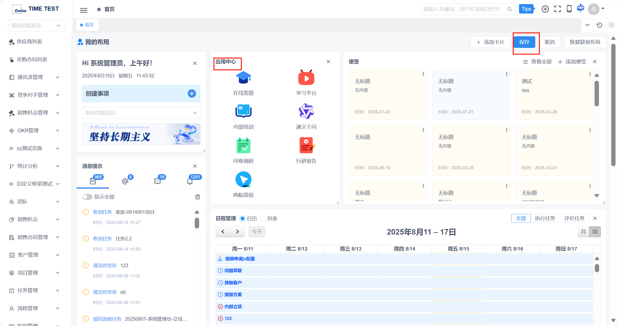 将新添加的“应用中心”卡片拖拽到首页的合适位置。点击 保存 按钮,完成卡片添加。