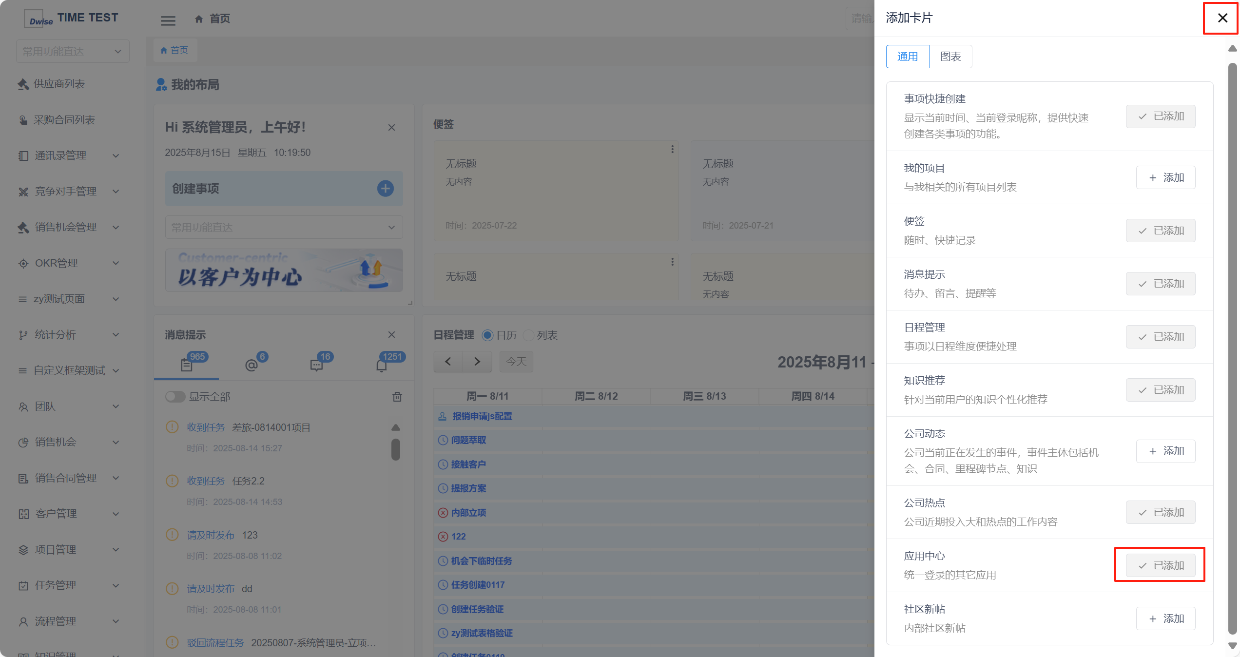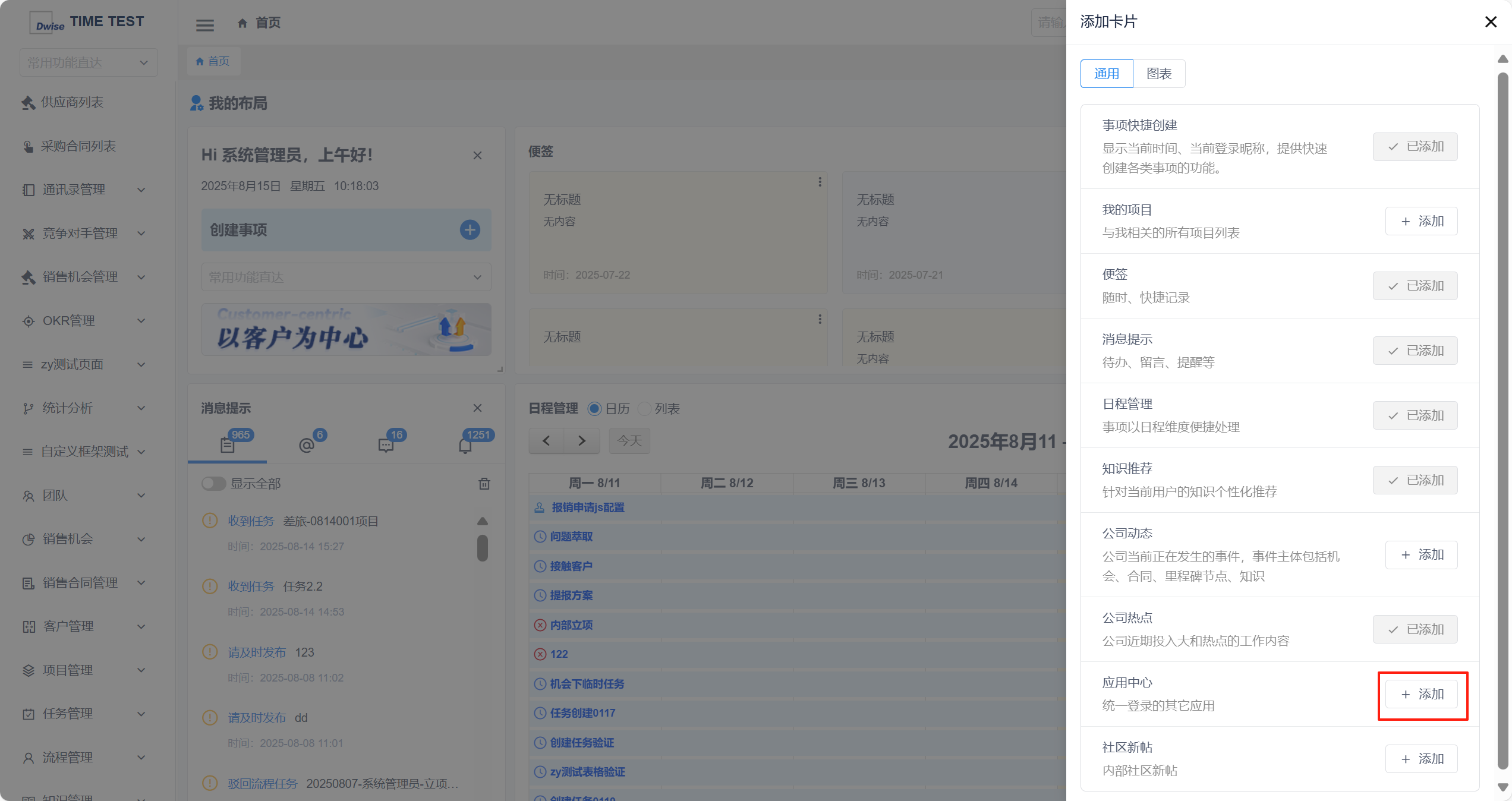 在“通用”分类下找到 应用中心 卡片,点击 添加 并 确认。添加成功时,按钮将显示为“已添加”。