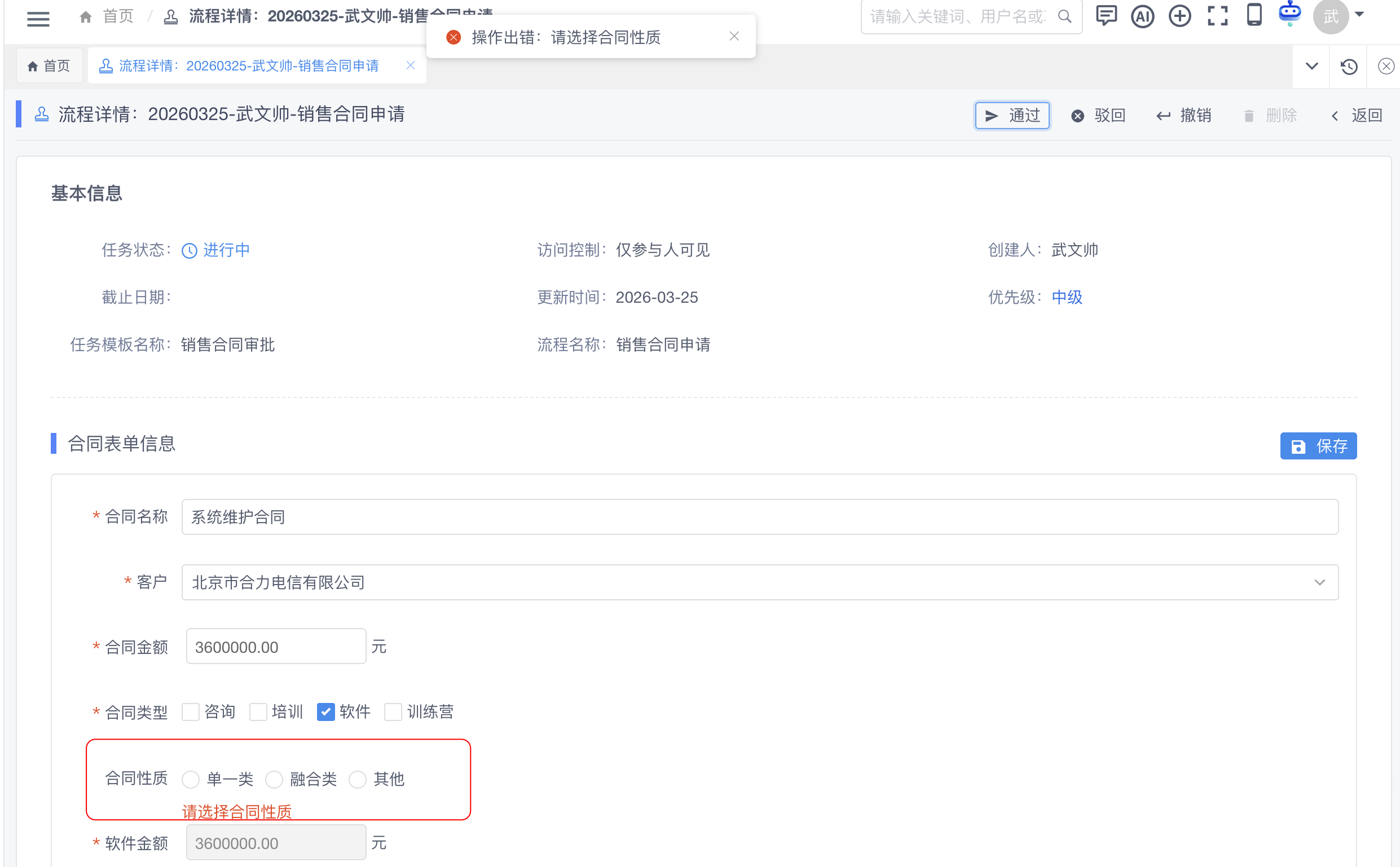 在销售合同申请流程中,【总经理审批】的节点需要选择“合同性质”