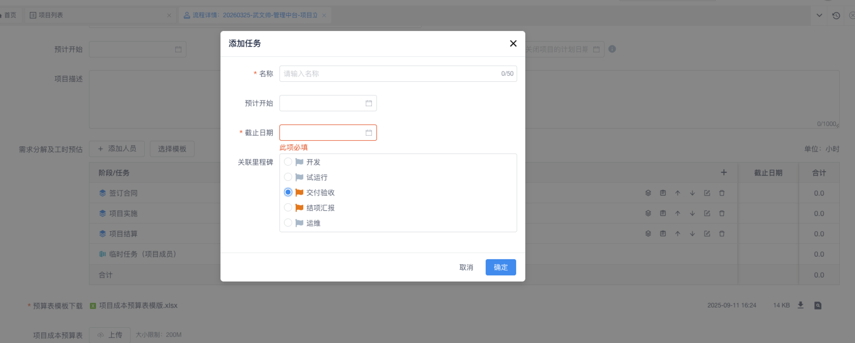 2) 扩展任务编辑 弹窗,增加字段:关联里程碑、预计开始、截止日期(如果关联了交付验收/外部结项这两个必选里程碑,该日期为必填)