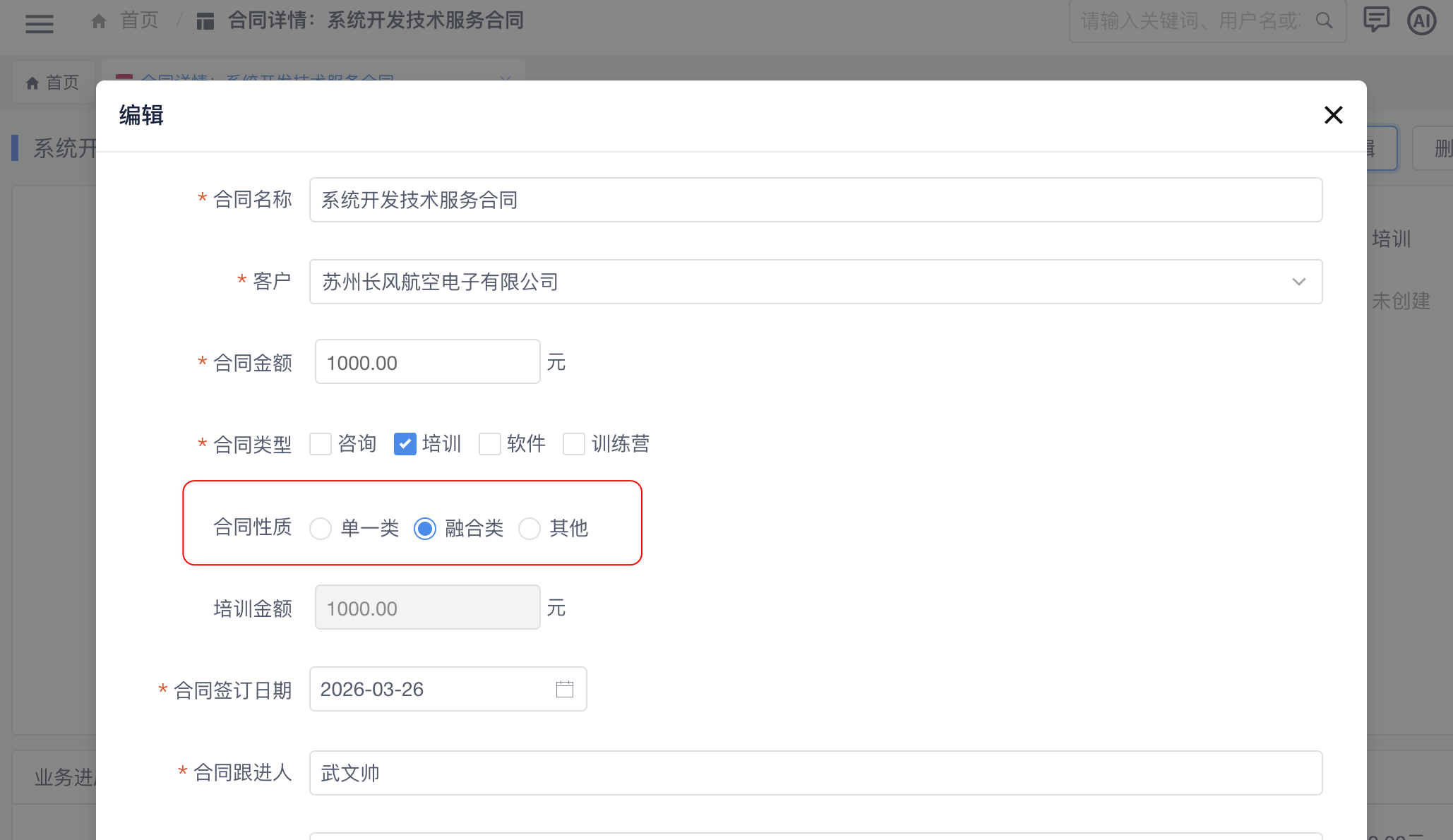 在销售合同的详情页面、编辑弹窗、合同列表页、合同导出中增加“合同性质”的字段