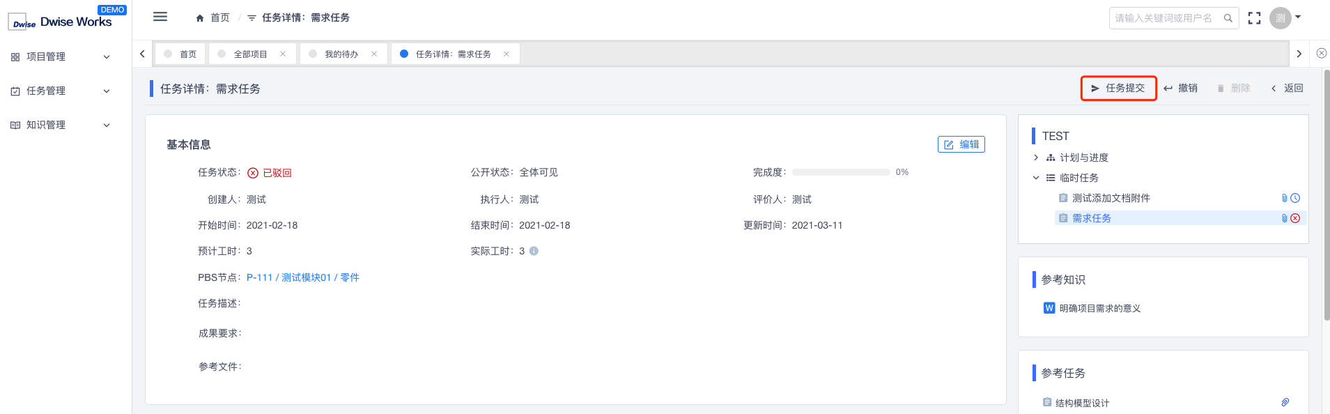 - 项目外的任务,在任务成果模块该任务的评价人有权限转化知识。