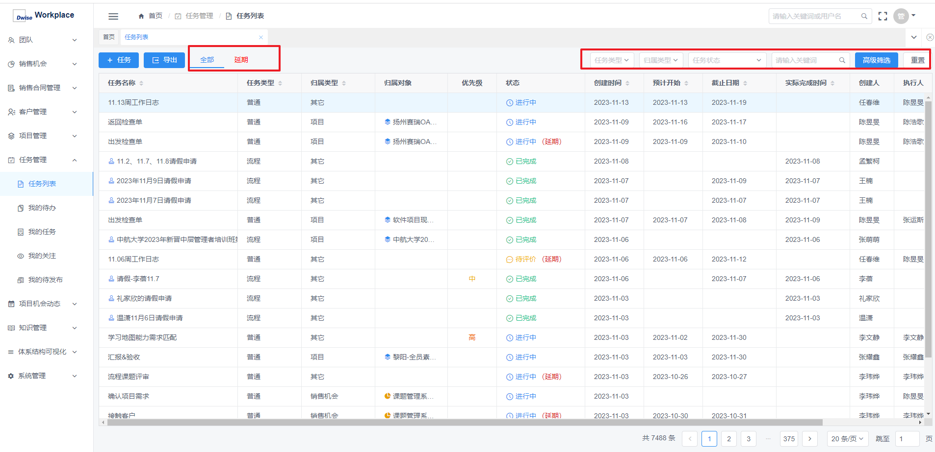 - 高级筛选支持任务类型,归属类型,归属对象,任务状态,执行人,评价人,预计开始,截止日期,完成时间过滤