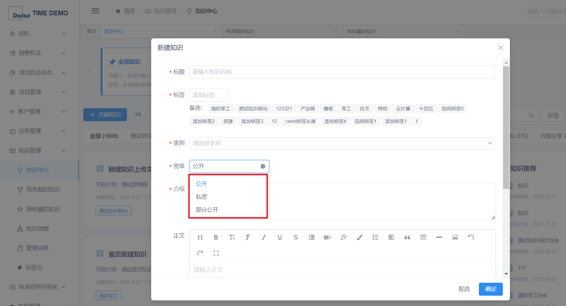 - 填写知识相关信息,选择可见范围,上传附件文档后,点击确定完成添加。