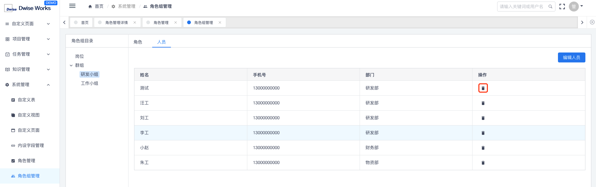 - 点击右侧顶部的“人员”切换至人员列表。在人员列表中点击人员右侧的“删除”按钮,确认删除后完成人员删除操作。
