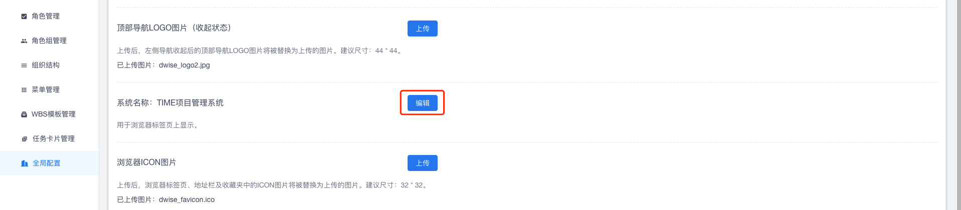 - 在全局配置菜单下,点击系统名称右侧的“编辑”按钮,修改系统名称。