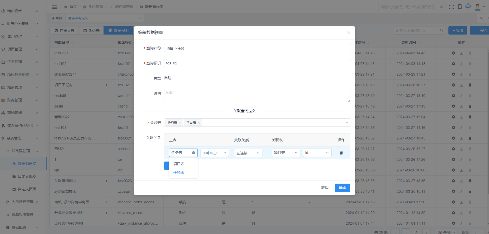 1.输入查询名称、查询标识、说明字段, 2.关联表支持自定义表、系统表;选择多个表(>=2)后,配置关联关系即可 3.填写完字段后点击确定按钮,关闭新建数据视图弹框,数据视图列表第一行新增一条自建的数据视图数据