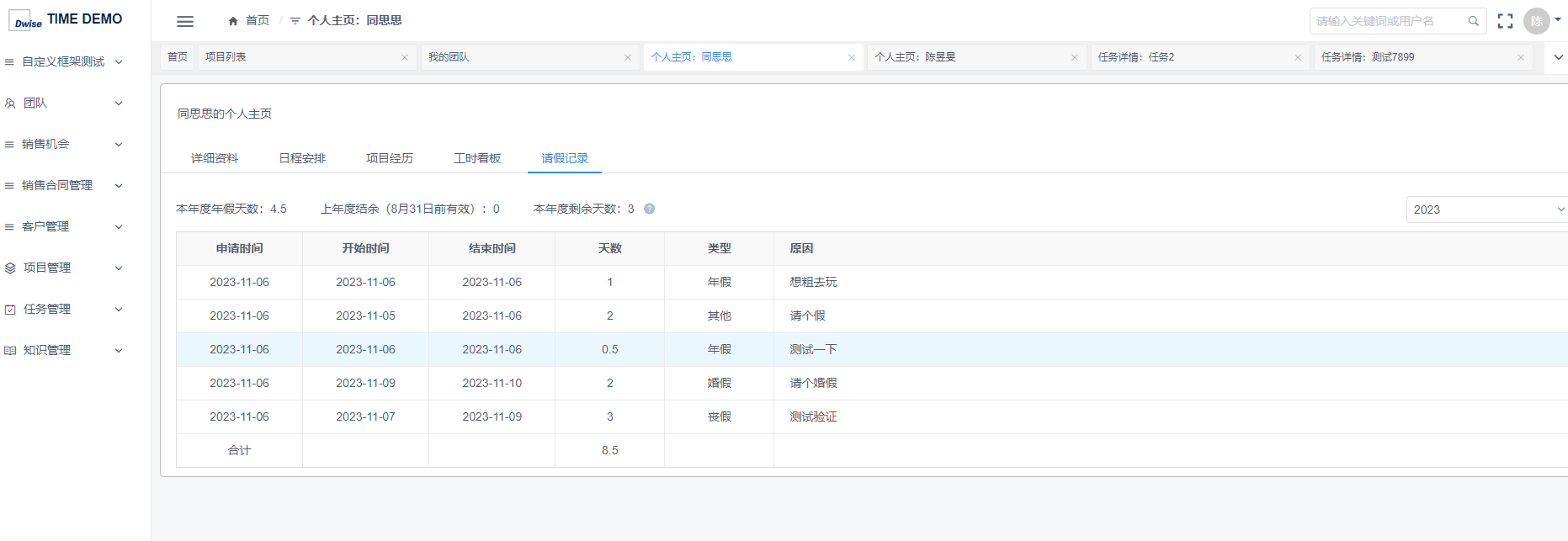 - 统计栏:显示本年度年假天数:天,固定不变;本年度剩余天数:天;当前可申请天数:*天