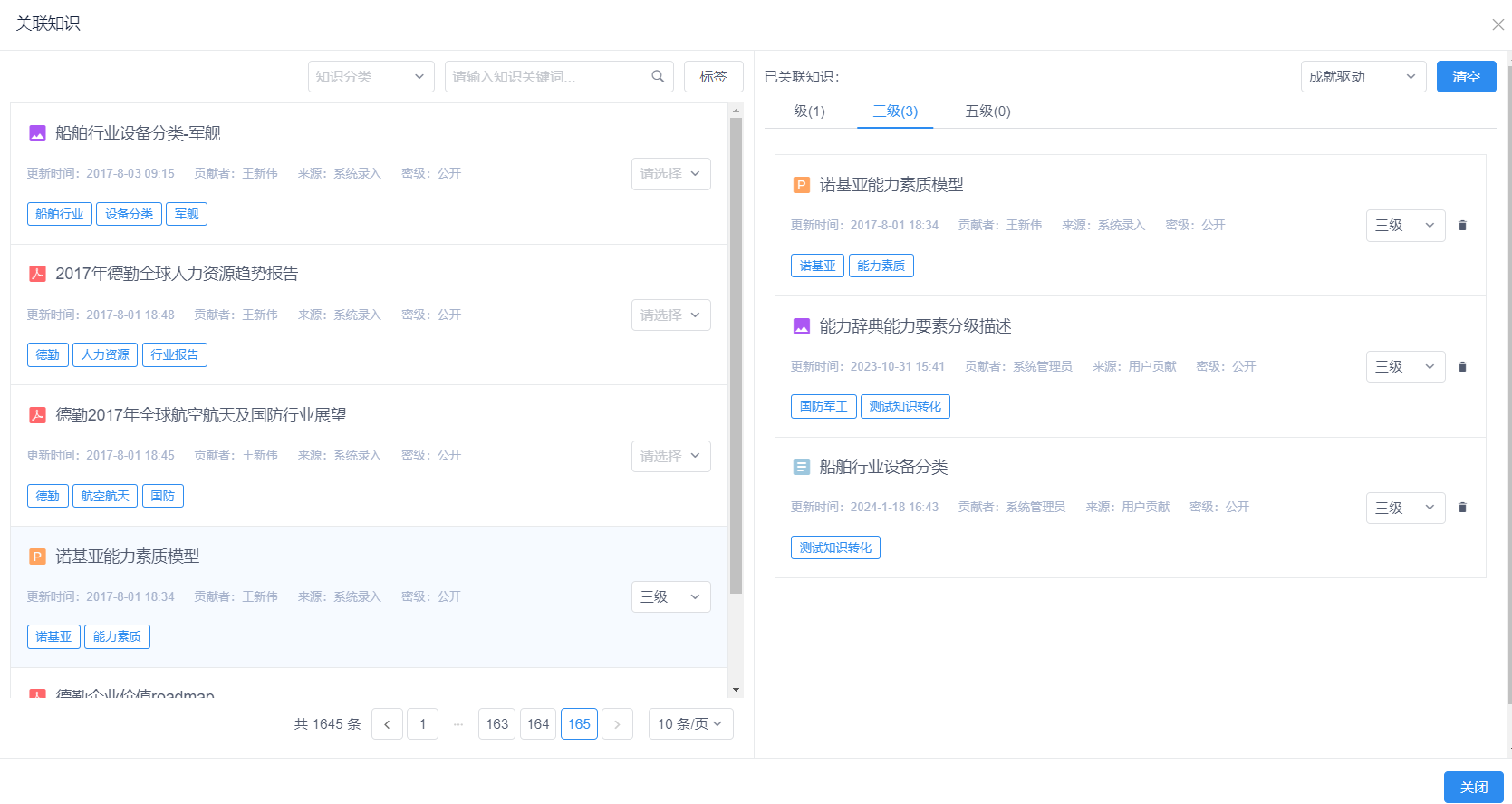 左侧显示系统中的全部知识列表,列表上方显示筛选框(按知识分类筛选)、搜索框、标签筛选按钮。知识后显示一级、三级、五级选项,再选中任一能力等级,右侧显示已选择知识列表,按照等级划分tab页,tab页下展示已选中的知识列表。列表显示知识基本信息、能力等级、删除按钮。