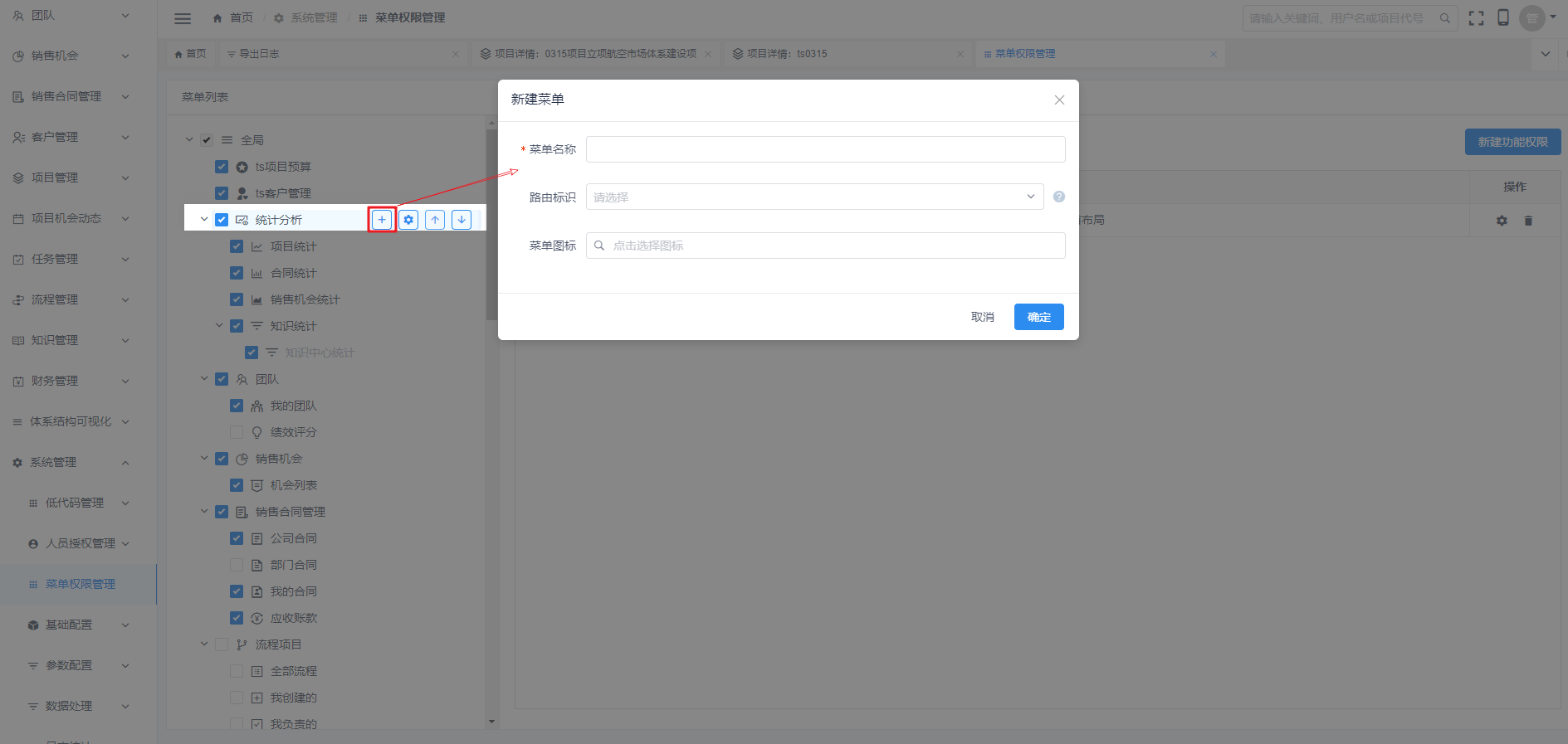 - 鼠标悬浮至目录节点上显示创建按钮,点击创建按钮,弹出新建菜单弹框,填写菜单名称,路由标识和菜单图标,点击确定后菜单新建成功。